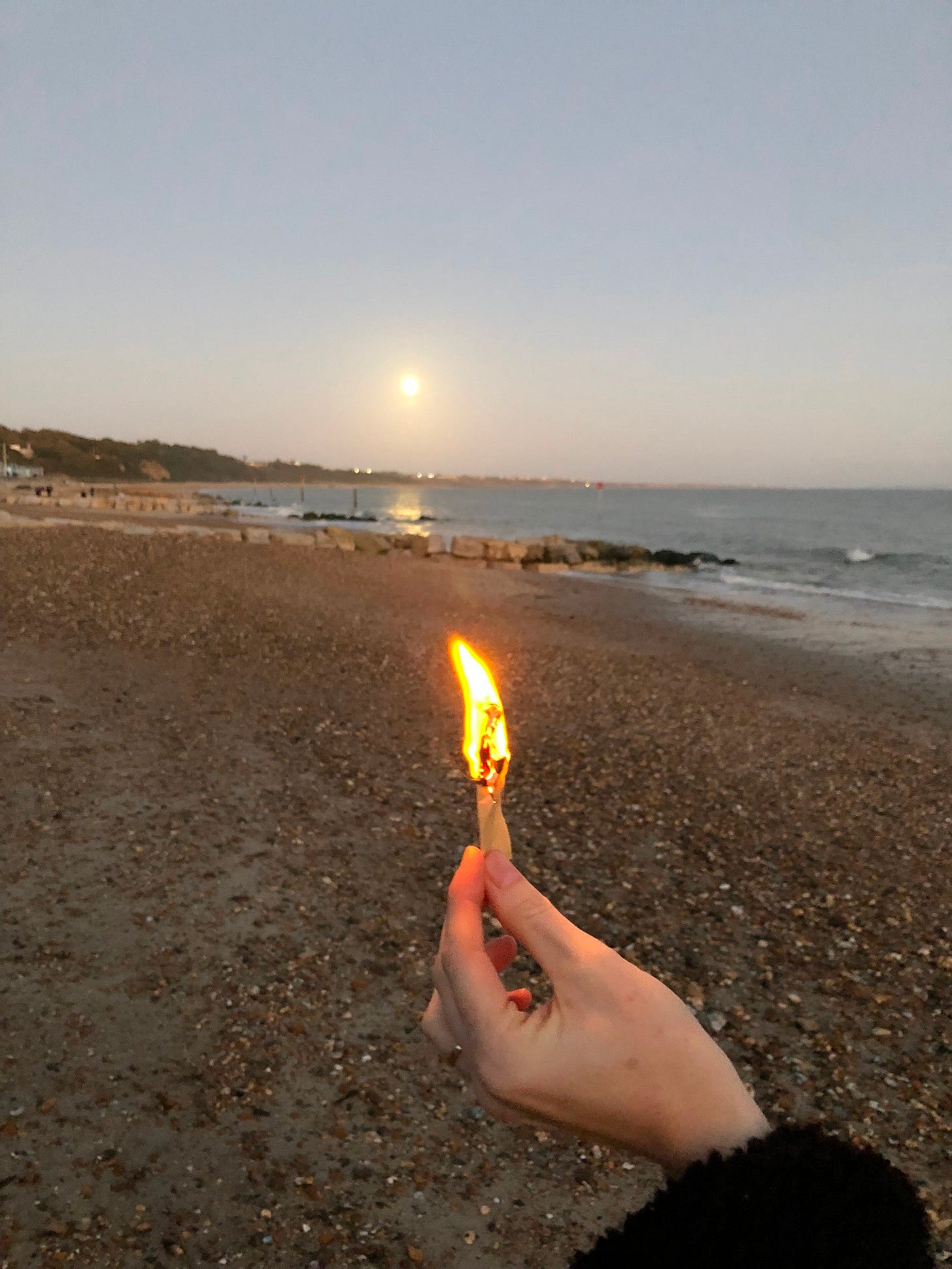 Sure enough, I had some baggage to burn. I took the liberty of blending advice from Menna and Daisy and wrote down something I was making an intention to quit. I asked my friend to capture the moment I released it to the flame and a second after the fire hit the paper, my friend’s friend exclaimed, “Ooh! A bat!” And there it was flitting around in my peripheral vision as I felt relief saying goodbye to what I didn’t need and also felt the flame getting dangerously close to my fingers.